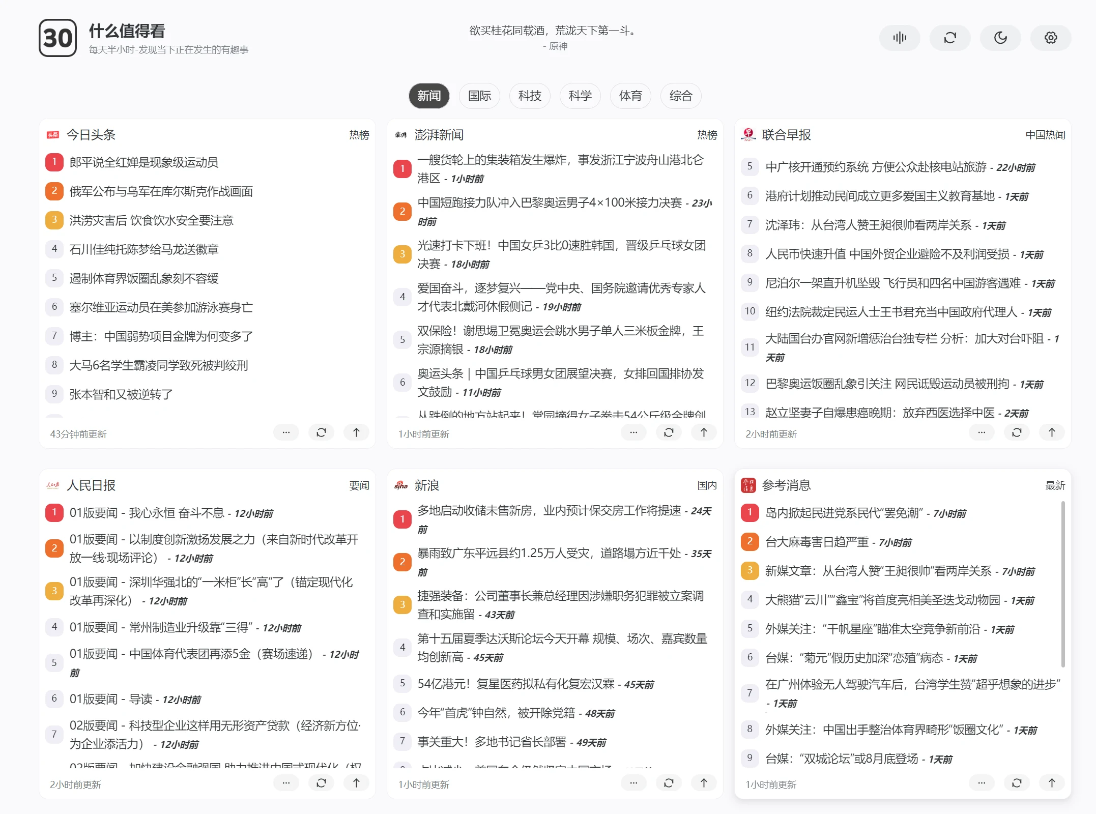 它聚合了新闻、国内新闻、科技科学新闻、体育新闻等多加媒体平台的内容,极简有序的排版方式可以让你以最快的速度了解各个平台的热点内容,让你知晓现在正在发生什么