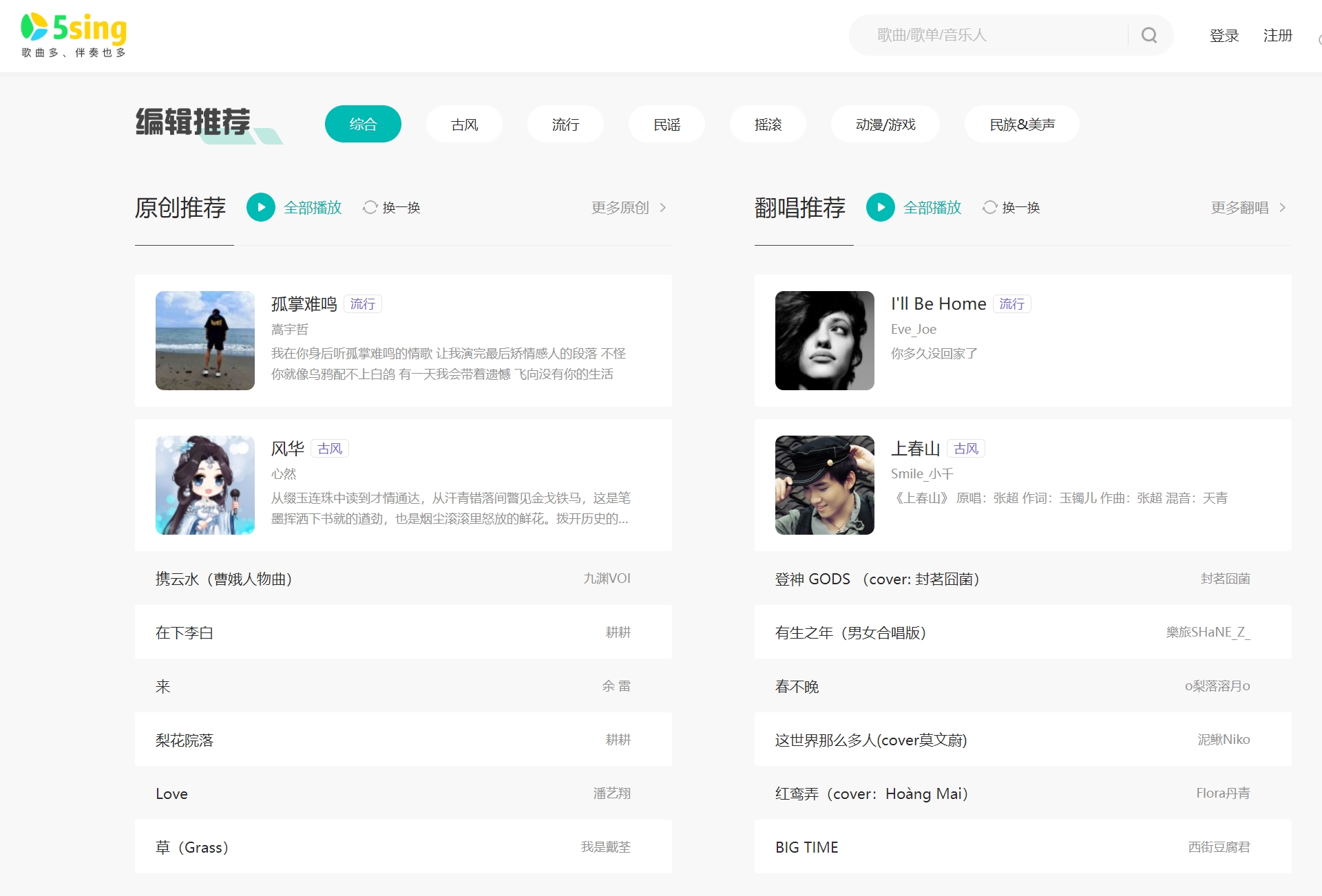 该网站每天有1万多首原创歌曲被上传到5sing,有古风、流行、摇滚、搞笑、另类、民族、动漫等等歌曲风格。